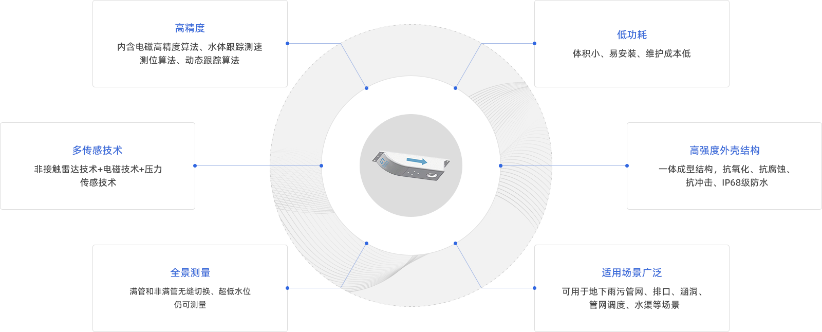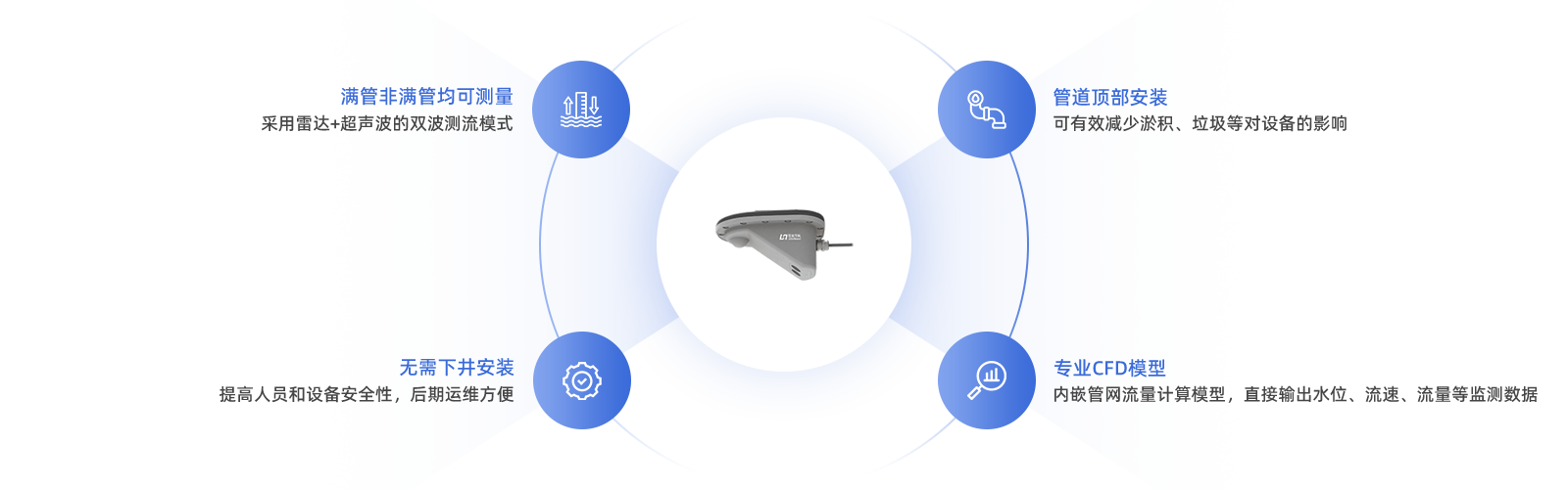 本产品是普适全新管网测流产品,高度集成了雷达测流和超声波测流优势,实现满管非满管全场景测流吗,针对城市雨污水管网、入河排口等场景开发的流量在线监测产品。